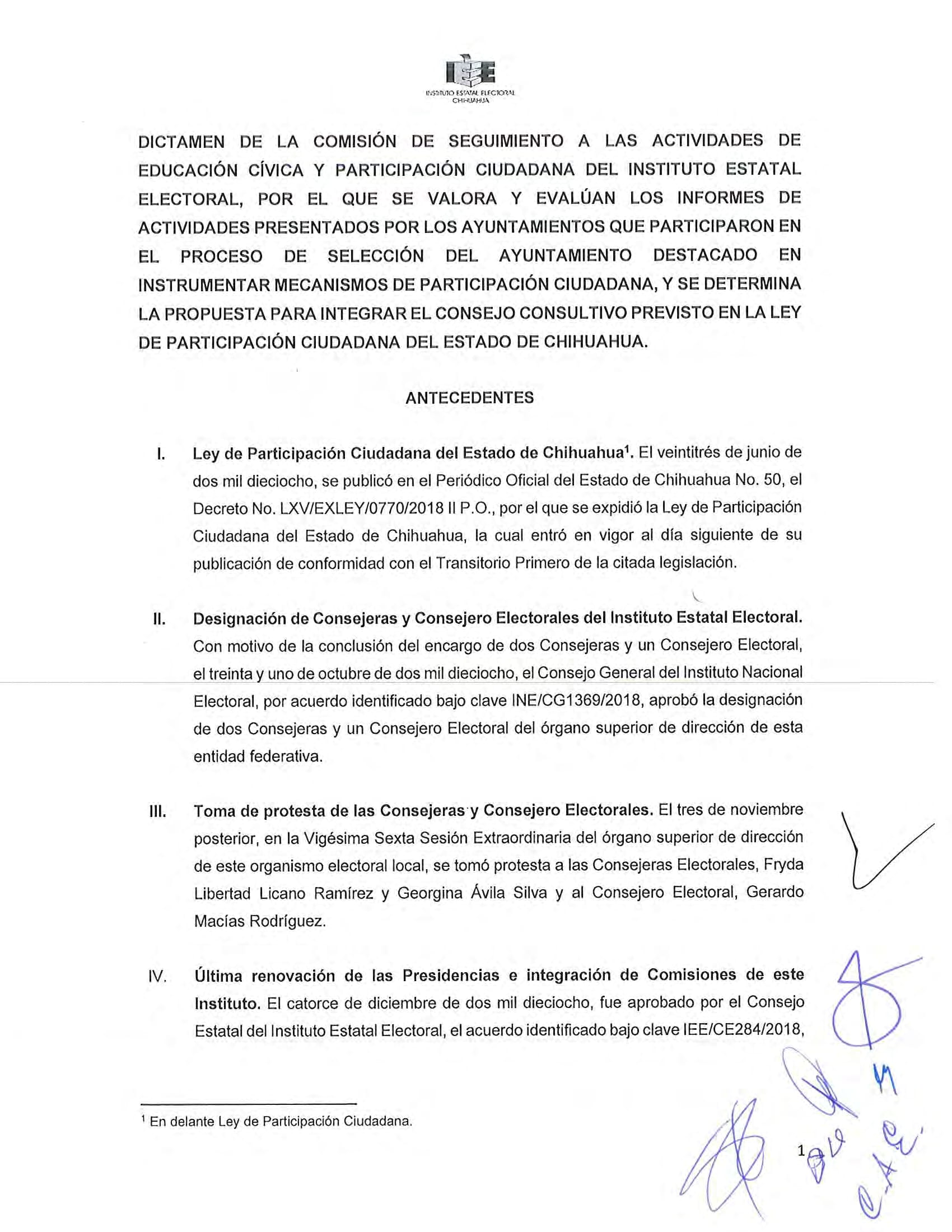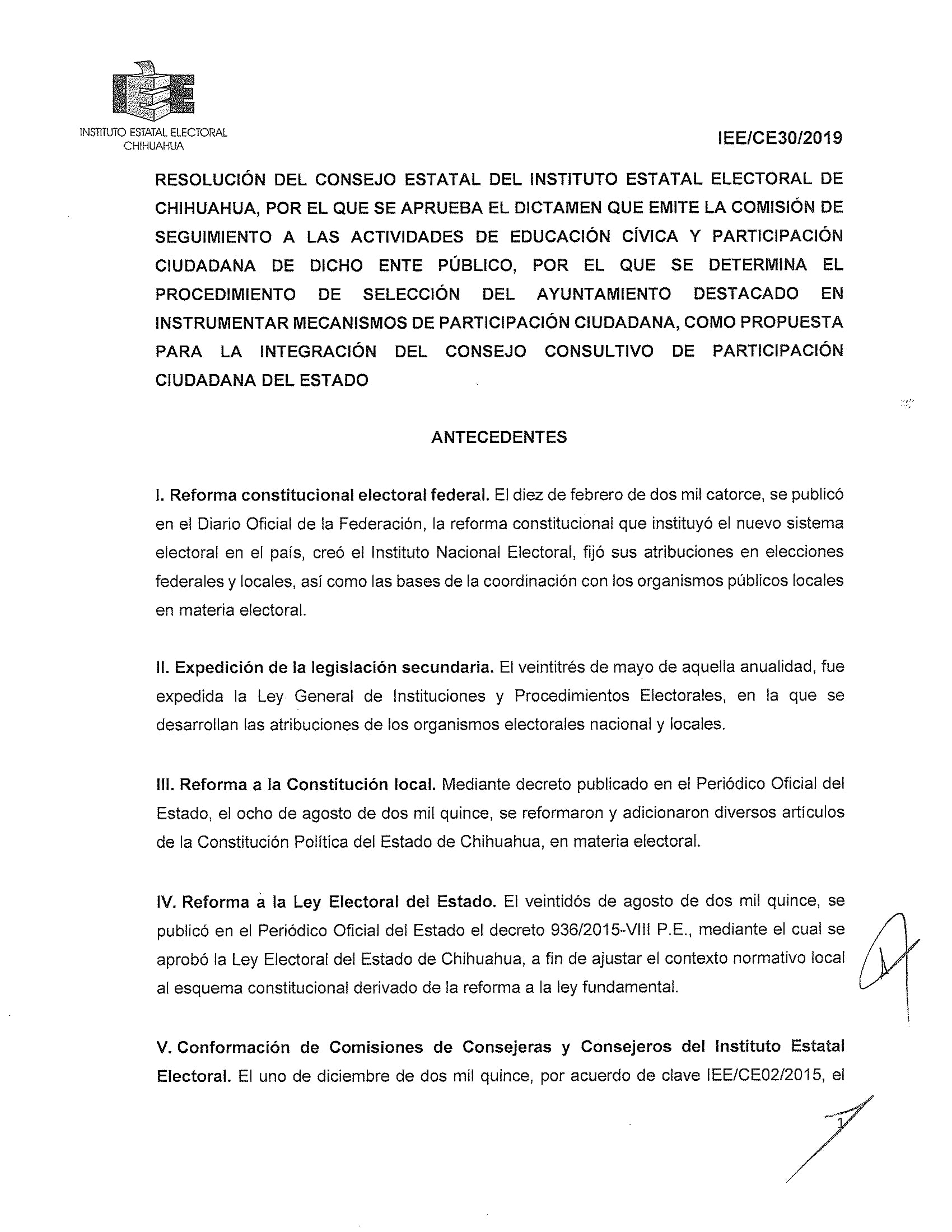El Instituto Estatal Electoral de Chihuahua (IEE) invita a los Ayuntamientos que deseen participar en la Convocatoria de Ayuntamiento Destacado 2024, con el propósito de seleccionar al Ayuntamiento que se haya destacado en instrumentar mecanismos de participación ciudadana y que tenga interés en integrarse al Consejo Consultivo de Participación Ciudadana que establece la Ley de Participación Ciudadana del Estado de Chihuahua con fundamento en lo dispuesto en el artículo 9 de la Ley de Participación Ciudadana del Estado de Chihuahua y 18 del Reglamento de la citada Ley. El Ayuntamiento Destacado será elegido de entre los ayuntamientos que participen en el procedimiento de selección, conforme a la convocatoria que para tal efecto emite el IEE y que se reproduce arriba en este sitio, bajo los siguientes elementos de evaluación: