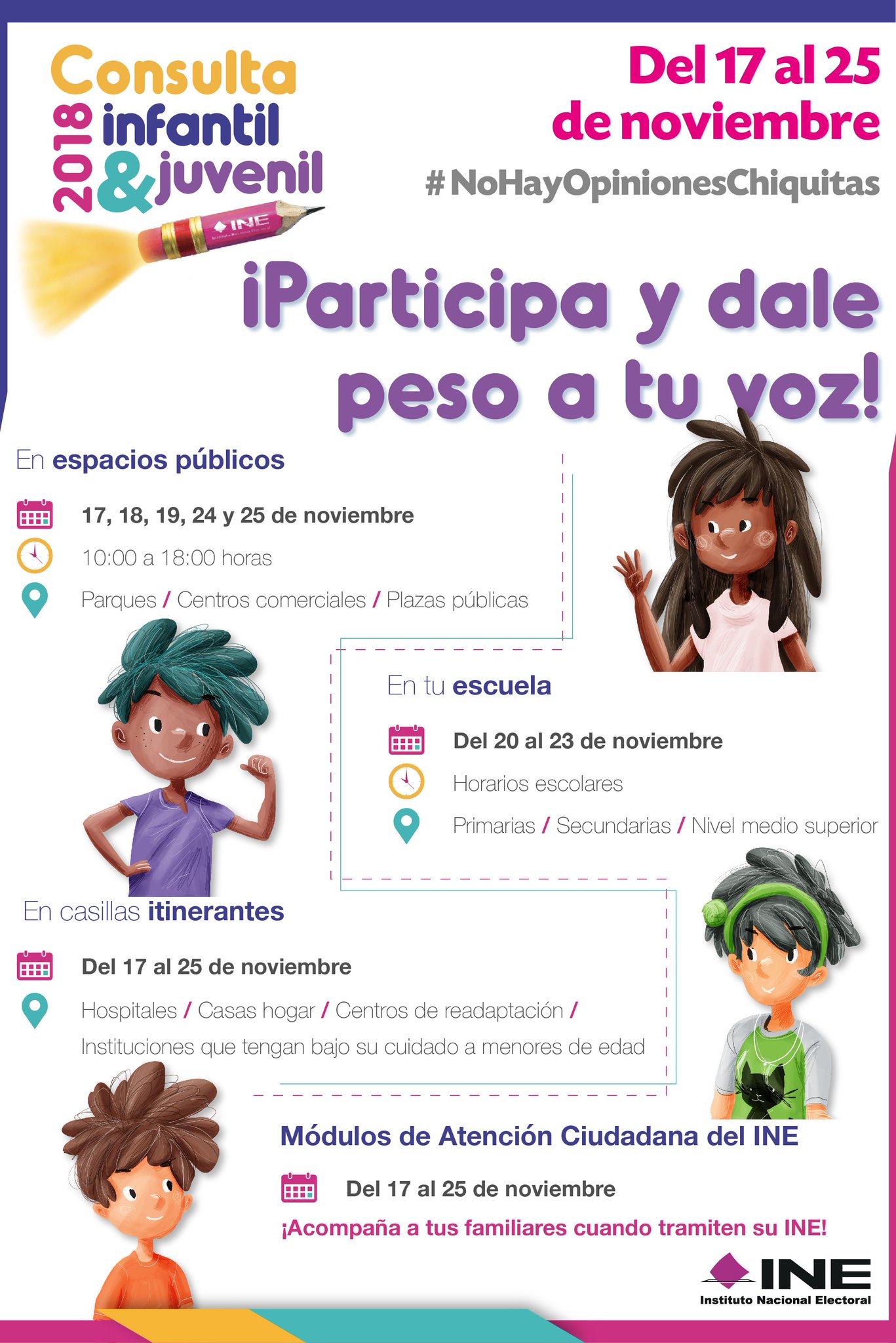 La participación en la consulta será para categorías de 6 a 9 años, de 10 a 13 años y de 14 a 17 años. En escuelas de educación primaria, secundaria y media superior, las casillas se instalarán y operarán del 20 al 23 de noviembre. En los espacios públicos de mayor afluencia e itinerantes, será en los días 17, 18, 19, 24 y 25 de noviembre. En los Módulos de Atención Ciudadana del INE se recibirán las participaciones el día 17 y del 20 al 24 de noviembre de 2018.