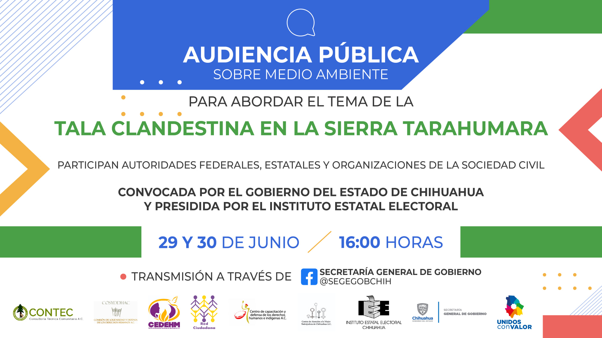 La audiencia pública se realizará de 16:00 a 18:00 horas en la modalidad virtual; la autoridad convocante es el Gobierno del Estado de Chihuahua, a solicitud de varias Organizaciones de la Sociedad Civil. Su principal objetivo es conocer y visibilizar la problemática que existe en la región y lograr que sea considerada de atención prioritaria por parte del Estado con presupuesto público designado para garantizar los derechos humanos de los Pueblos Originarios.