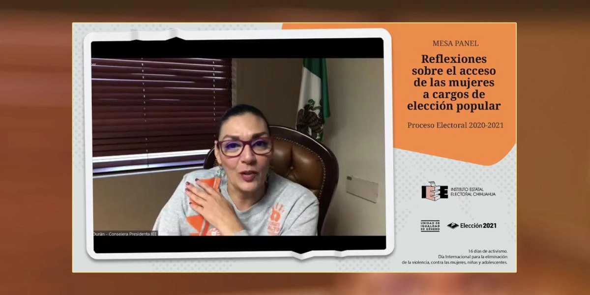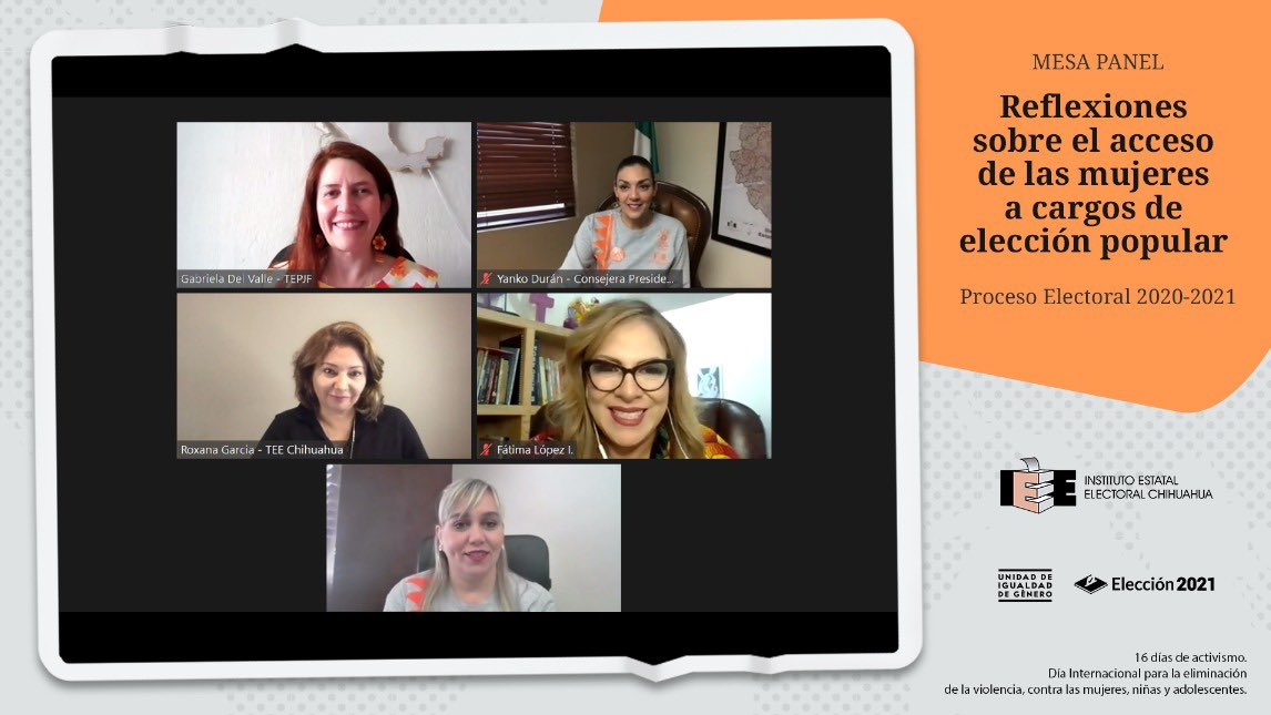 Chihuahua, Chih. — En el marco de los 16 días de activismo por los derechos humanos y contra la violencia de género, el Instituto Estatal Electoral de Chihuahua (IEE) convocó a la mesa panel “Reflexiones sobre el acceso de las mujeres a cargos de elección popular. Proceso Electoral 2020-2021”, donde participaron tres expertas en la materia, quienes visibilizaron la discriminación, la violencia de género y el liderazgo de las mujeres, entre otros temas.